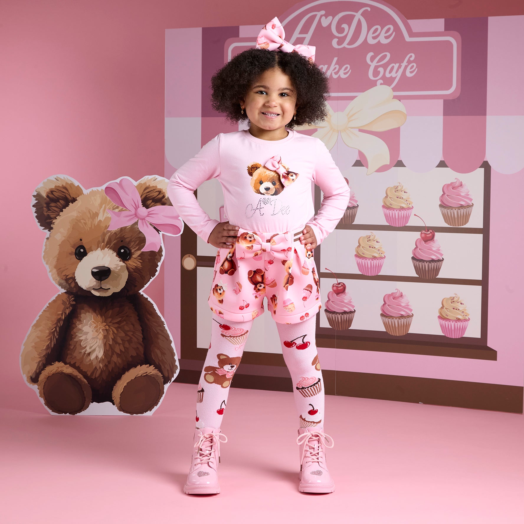 This two piece set is as cute as can be! It includes teddy bear printed shorts with a comfortable stretchy, striped waistband and the cutest bow at the front. Paired with a long-sleeved top with a beary cute teddy bear artwork on the front.