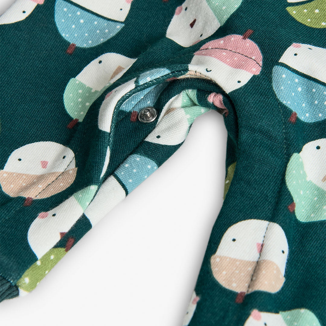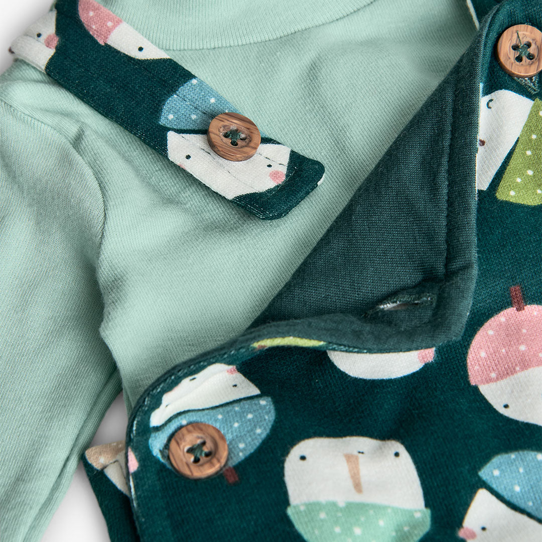 This light green knit for baby, consisting of a long-sleeved bodysuit and dungarees with a smiling acorn print. Made from soft cotton, it's ideal for keeping your baby comfortable and warm during cooler seasons. The decorative buttons on the dungaree straps add a charming and practical detail, making it easy to put on.