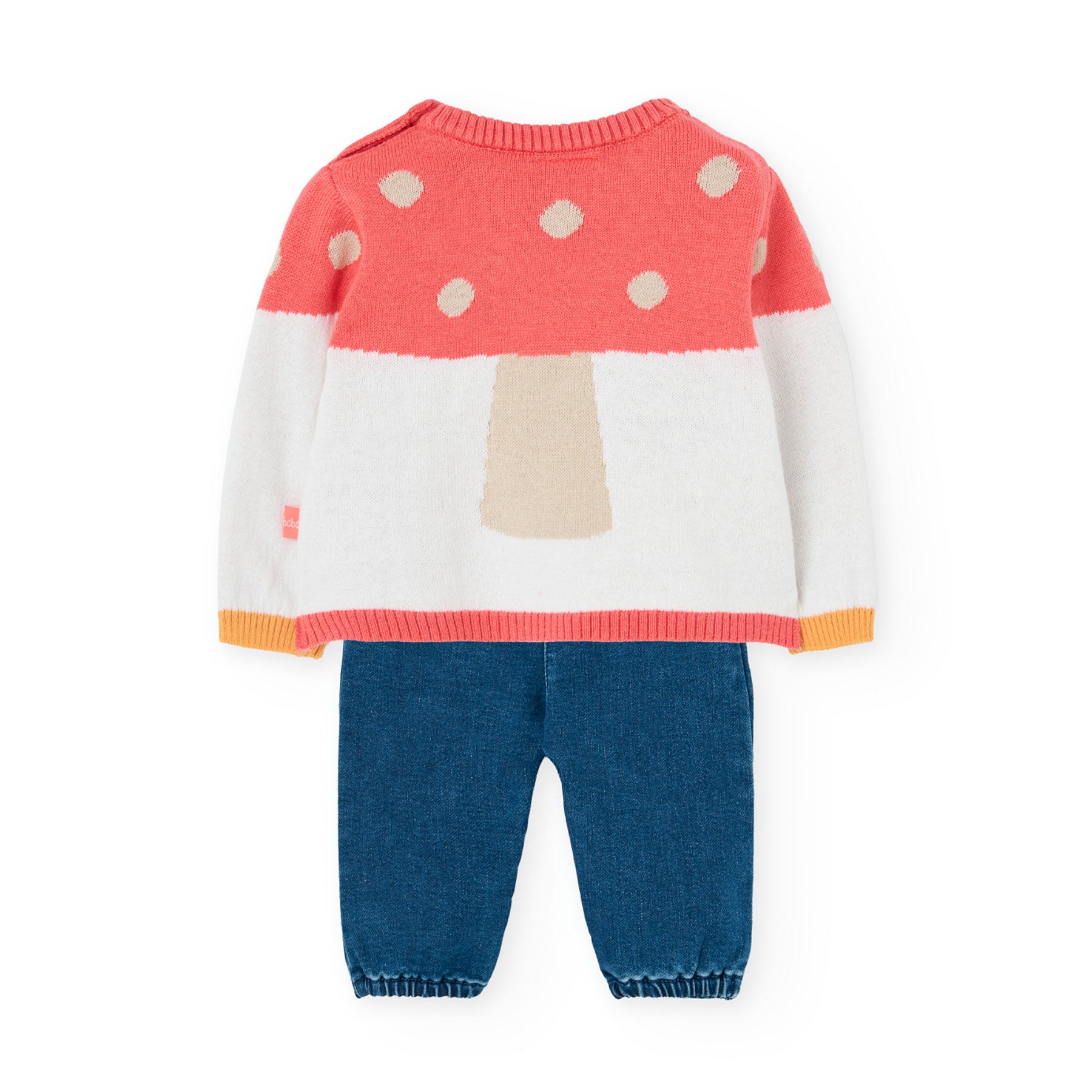 This adorable cotton set includes a knitted jumper with a sweet mushroom print, along with matching faux denim trousers. This outfit offers warmth and comfort as well as style for your little one.