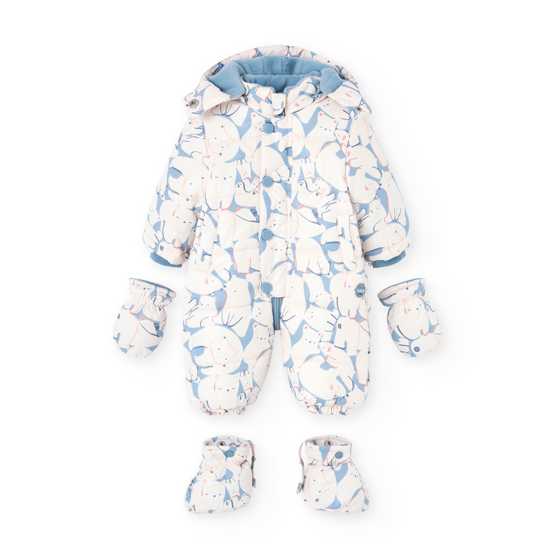 Technical knit snowsuit for babies in crude colour with animal prints represents the perfect choice to keep your little one warm during the cold months. Crafted from quilted technical material, it ensures warmth and comfort on winter days.