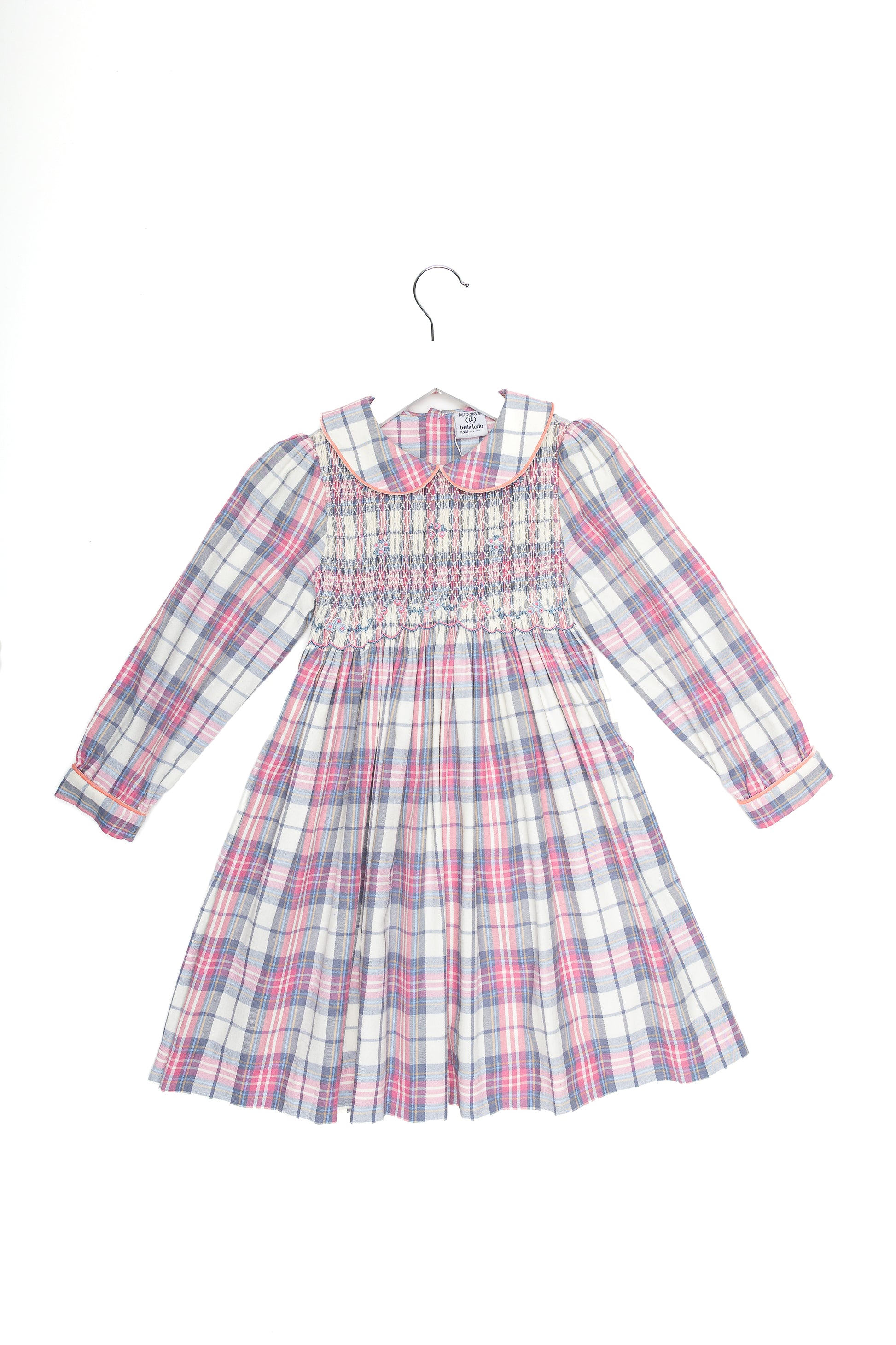 Isabella Tartan dress pink & blue with long sleeve & large rose smocking