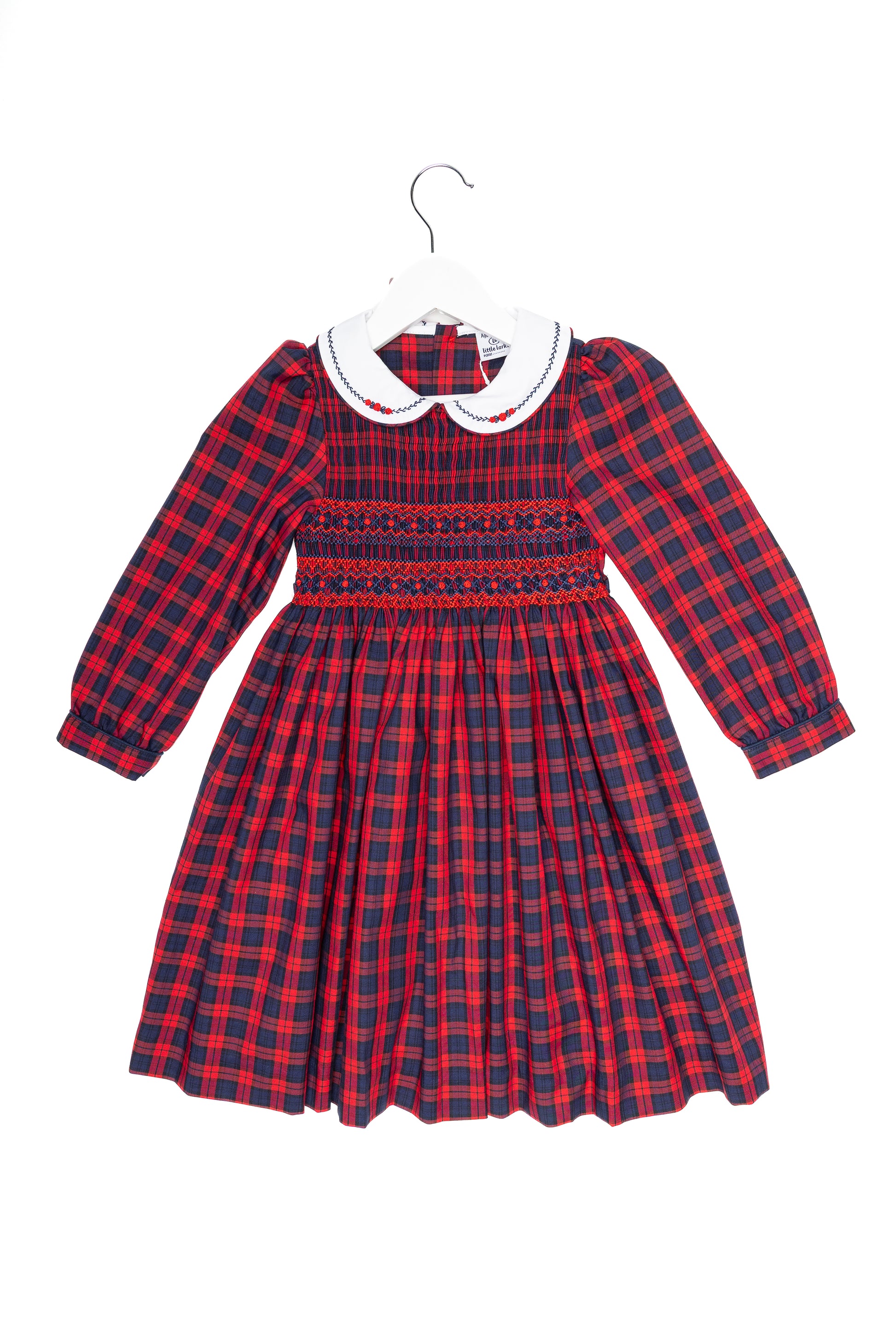 Rachel Red and Navy Tartan dress with red rose buds, white collar and rosebud embroidery on collar